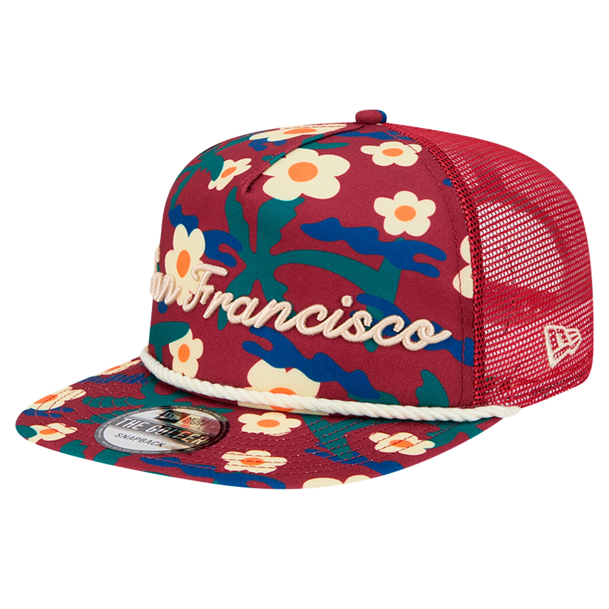Stay cool while representing your San Francisco Giants with this New Era Summer Cab Golfer Adjustable Hat. This Golfer cap features a semi-structured fit with a pinched crown and flat visor, evoking the classic snapback style of the ’80s and ’90s. The embroidered script across the front proudly displays San Francisco, while a sublimated floral print on the front and bill adds a touch of summery flair.