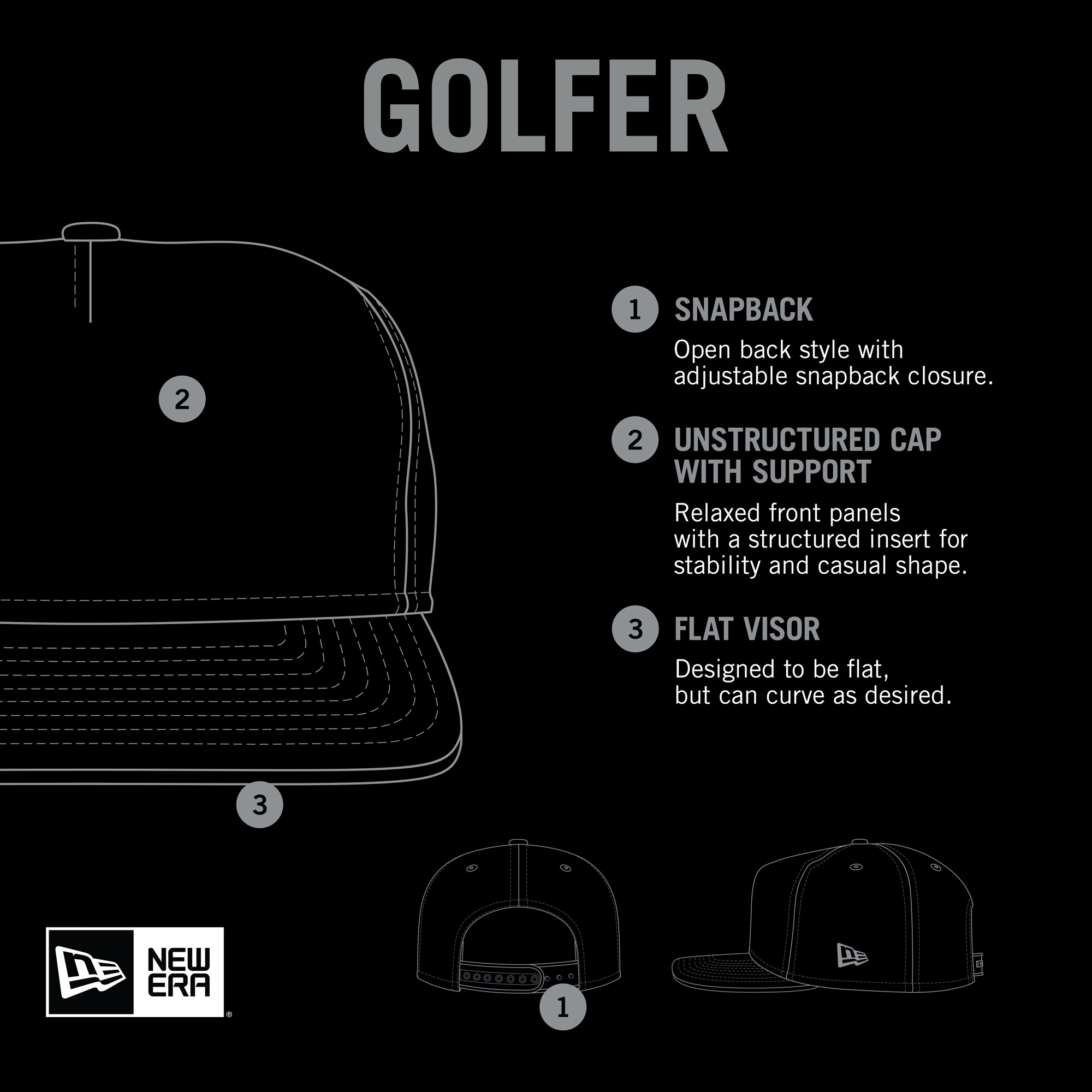• The Golfer is a semi-structured cap, with a pinched crown and flat visor which gives a retro look and shape like snapbacks from the ’80s and ’90s