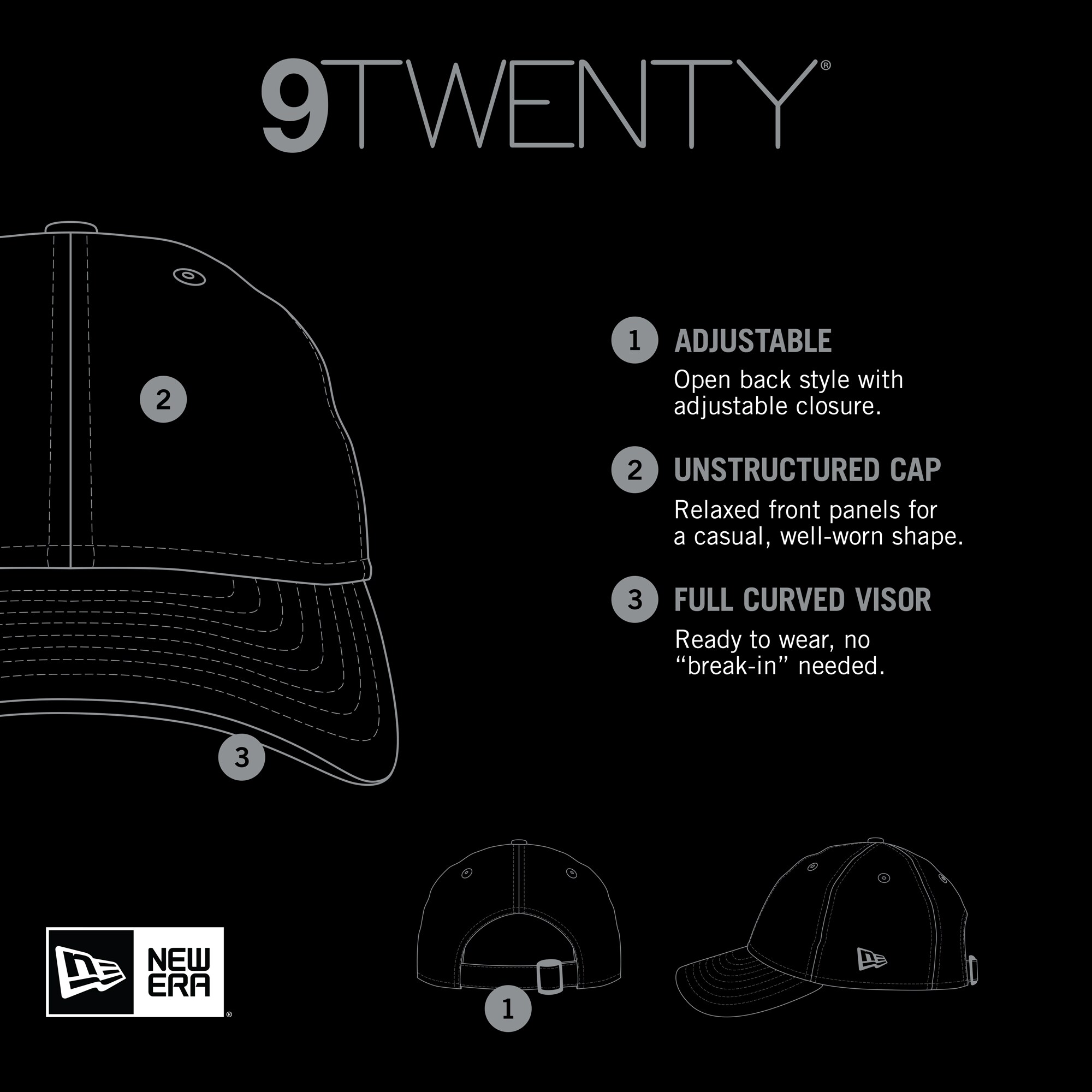 - The 9TWENTY is New Era’s relaxed fit adjustable silhouette, providing a well-worn look that sits low